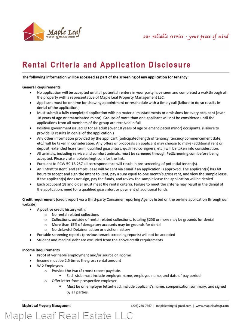 View our Rental Criteria and Application Disclosure at http://mapleleafmgt.com